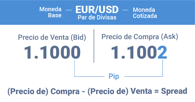 En la plataforma verás dos precios: EUR/USD 1.1002 / 1.1000, siendo el primero el precio de compra (ask) y el segundo el de venta (bid). Esta es la forma estándar en la que los brókeres muestran la información de precios para todos los pares de divisas.