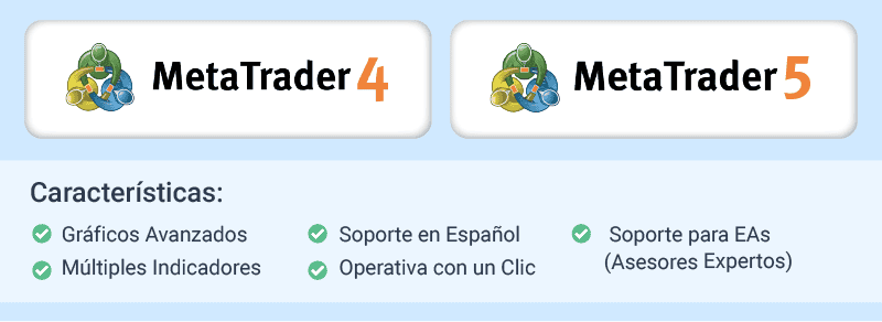 MetaTrader 4 (MT4) y MetaTrader 5 (MT5) son las plataformas más populares y reconocidas de la industria. Son ofrecidas por una gran cantidad de brókeres y cuentan con la confianza de traders de todo el mundo. Esto se debe a que ofrecen funciones avanzadas diseñadas para un trading de nivel mucho más profesional y en muchos casos, se complementan con soluciones como TradingView.