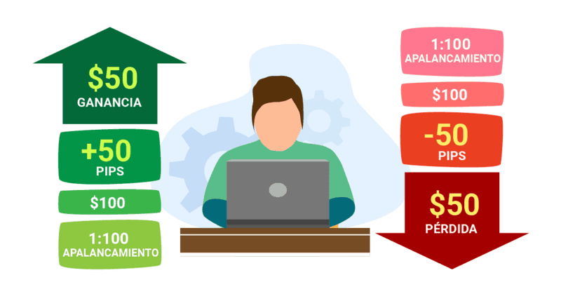 Luego está el apalancamiento, que te permite abrir operaciones más grandes que el saldo real de tu cuenta y trabaja en proporciones. Una proporción de 1:100, por ejemplo, significa que puedes controlar $10,000 con solo $100.