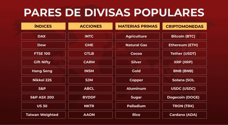 - Índices: Como el NASDAQ 100, S&P 500, o el DAX de Alemania.